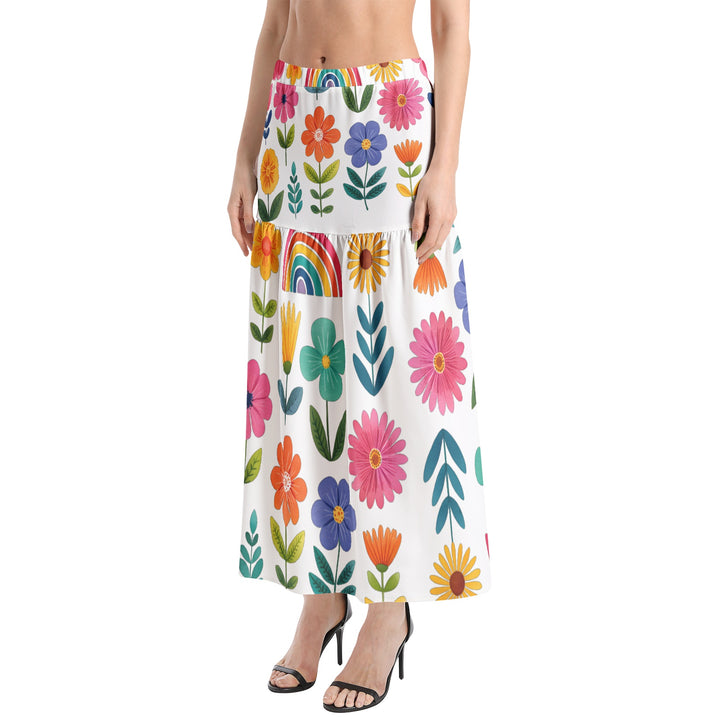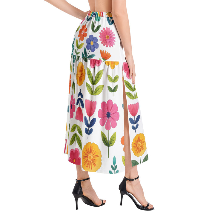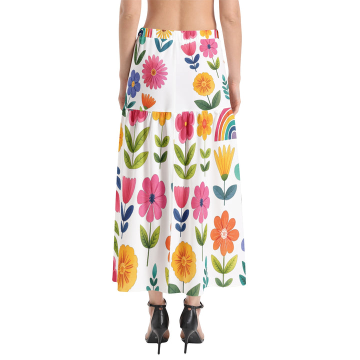 Cheerful Cartoon Flowers and Rainbow-Elastic Waist Ruffle Slit Hem Skirt